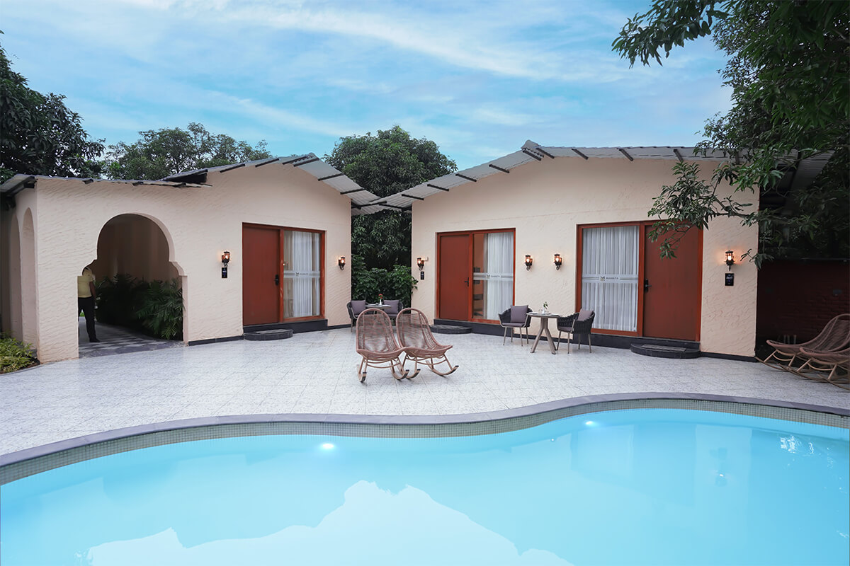 An infinity pool nestled in the forest, offering breathtaking views of the Ramganga River.