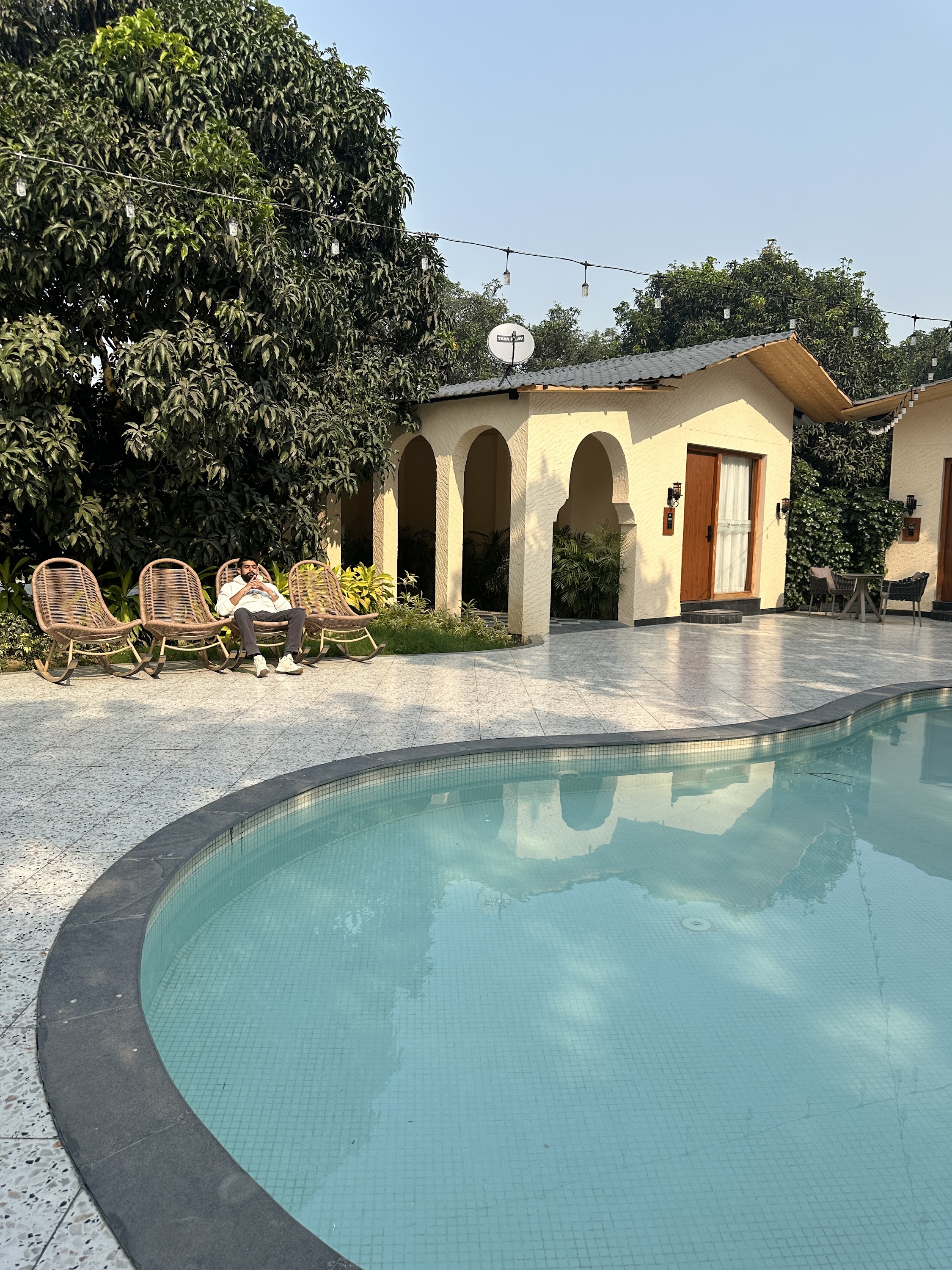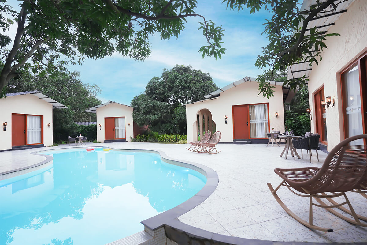 The Mamaya Resort Pool is the vibrant social heart of the property. Designed to accommodate large gatherings while offering intimate corners, this sprawling water body features a signature swim-up bar and designated zones for floating breakfasts. The crystal-clear blue waters are framed by the lush greenery of the surrounding mango orchard, creating a lively yet relaxing atmosphere for resort guests.